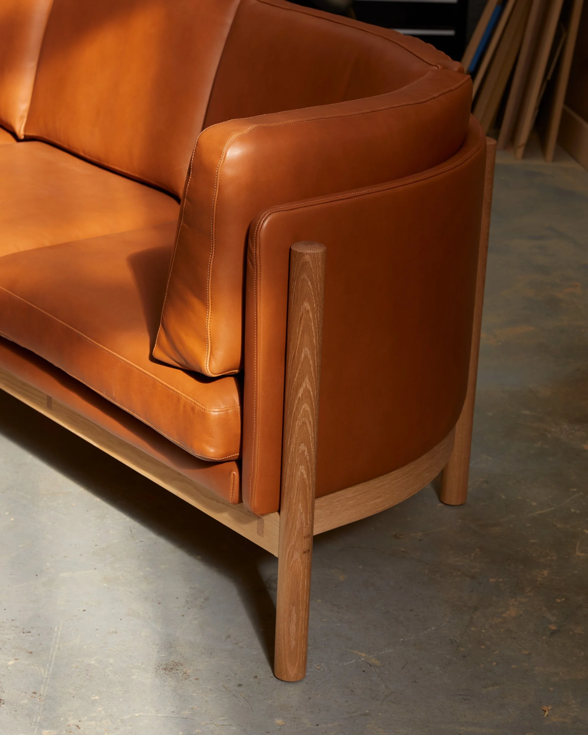 Made in collaboration between Made by Morgen and R.M. Williams for their George St flagship store in Sydney, the George St Couch is made using leather sourced from R.M. Williams. This bespoke couch, specifically designed for boot fitting, presented a unique challenge in creating its curved form. Extensive collaboration with the upholster was necessary to ensure the thicker-than-usual leather conformed to the couch's curved back.